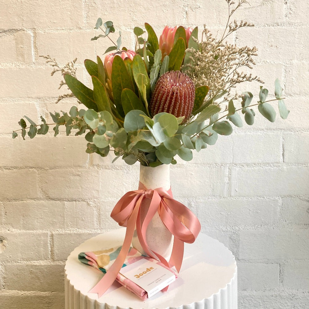 This bundle includes a stunning arrangement of native flowers in a charming white vase, paired with adorable, locally-made socks. Give your mom a gift that combines beauty and comfort in one unforgettable package.